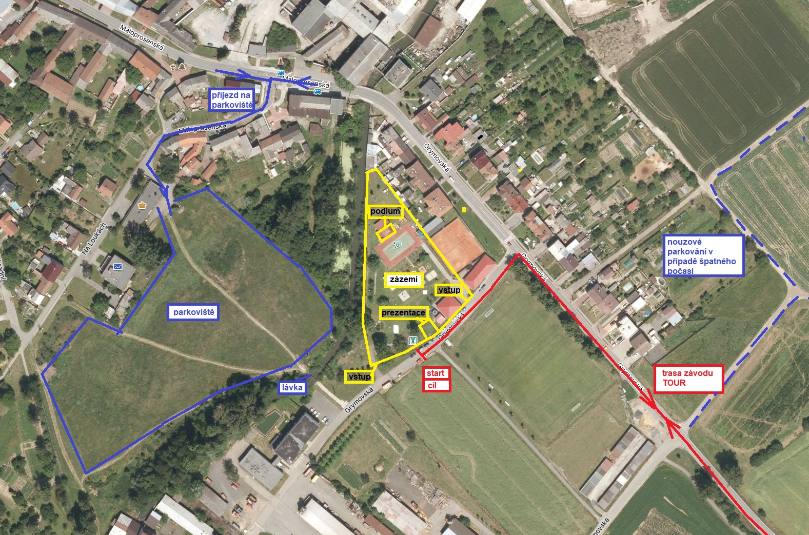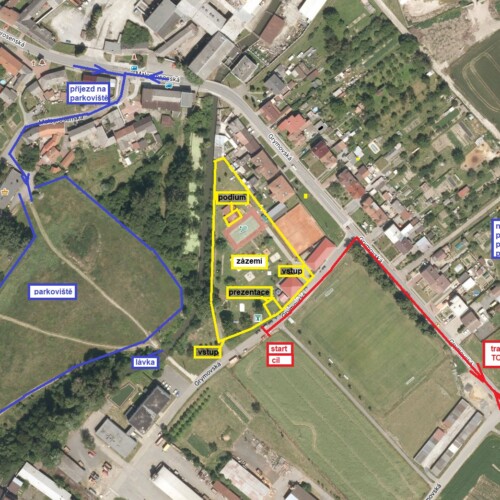 Parkování bude na travnaté ploše vedle sportovního areálu. Od parkoviště k zázemí je pochúzí lávka. V případě špatného počasí a podmáčeného terénu se bude parkovat na polních cestách viz obr.